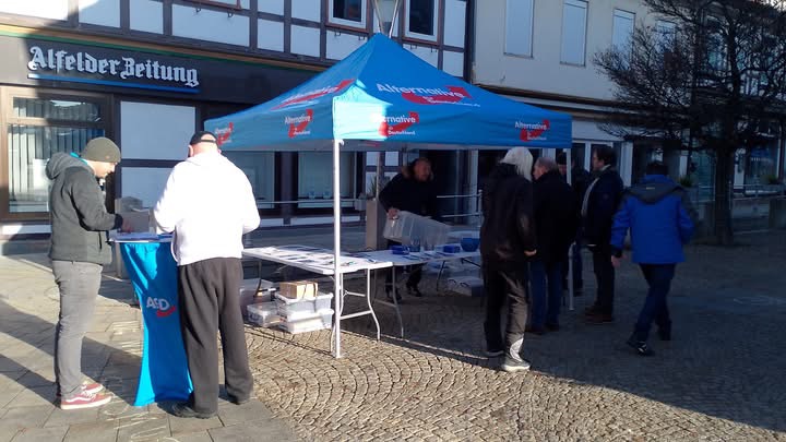 Es wurde gestern auch in Alfeld deutlich, dass die AfD immer mehr Zuspruch bekommt, was sich auch in der letzten Wahlumfrage des NDR ( AfD 20%) widerspiegelte. Besonders viele junge Leute zwischen 20 und 30 haben heute das Gespräch mit unseren Mitgliedern und Helfern gesucht.