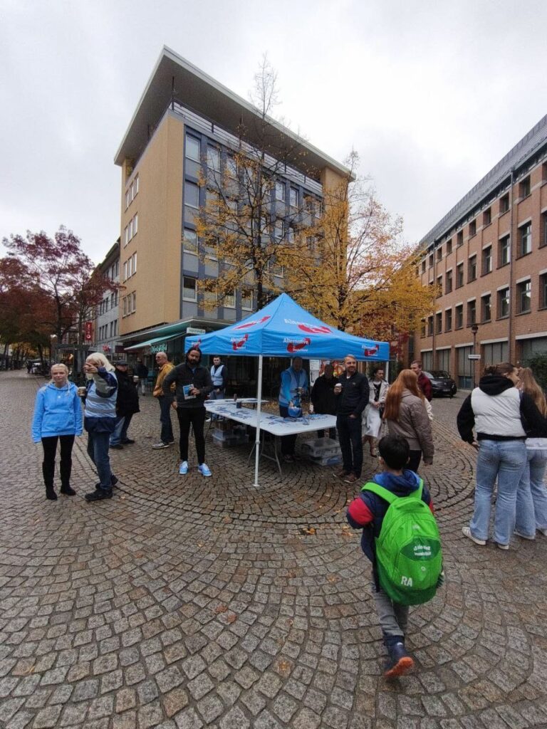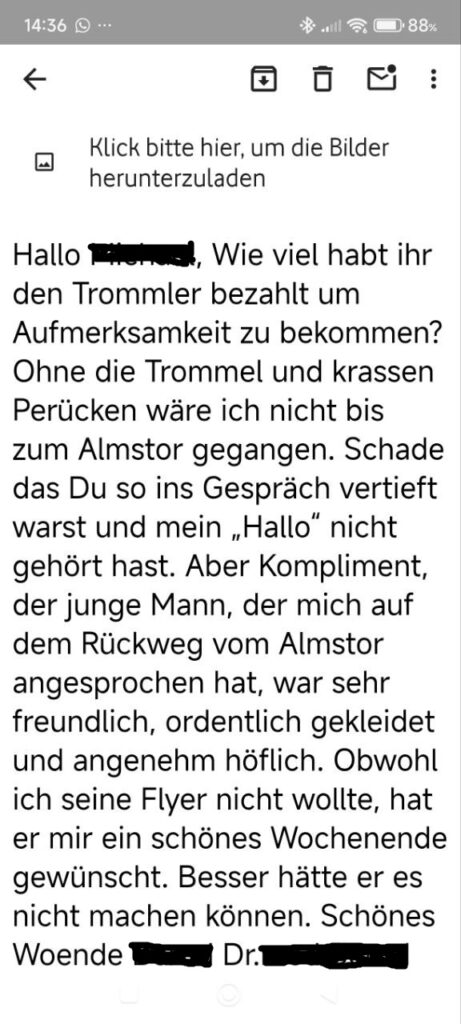 Diese Geräuschkulisse spielte unseren Akteuren eher in die Karten, wie die Nachricht an ein Vorstandsmitglied vermuten lässt. In den obigen Fotos können sie diese lesen. Vielleicht ja auch ein Grund, dass weitere 5 Besucher des Infostandes einen Mitgliedsantrag ausfüllten.